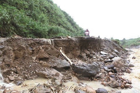 | Tronçon de la Nationale N°4D reliant les provinces de Lào Cai et Lai Châu (Nord) détruit par les crues de juin dernier. |