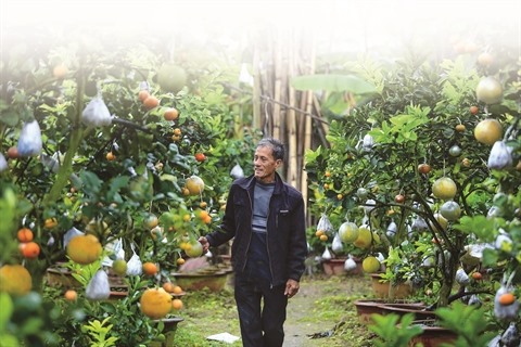| Lê Duc Giap dans son jardin de pamplemoussiers greffés. |