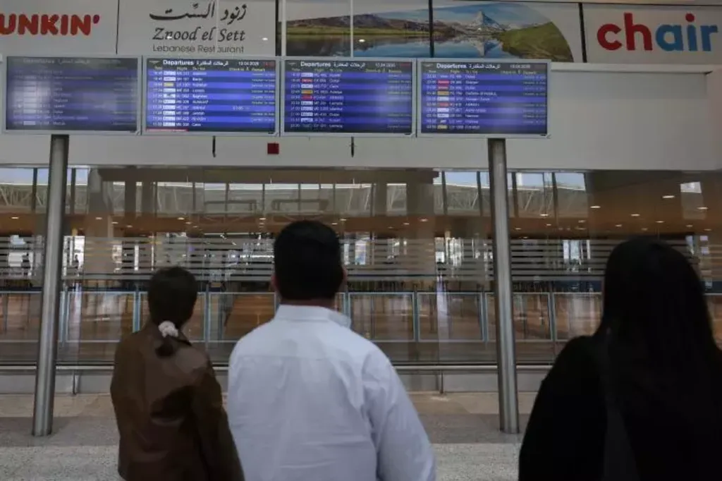 | Des passagers scrutent leur vol sur les écrans de l'aéroport de Beyrouth, le 10 avril. |