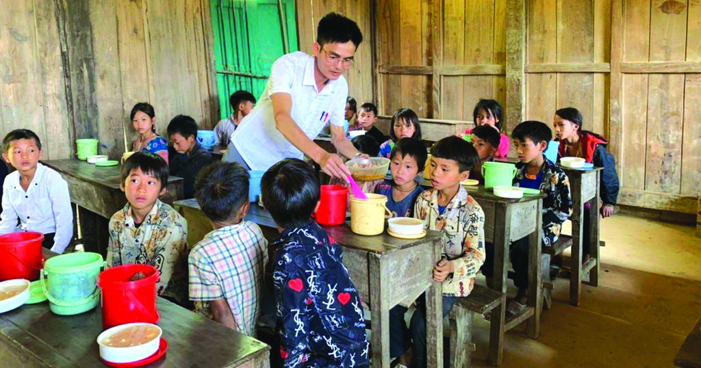 | L’enseignant Trân Nam San distribue de la nourriture aux élèves pour le déjeuner. |
