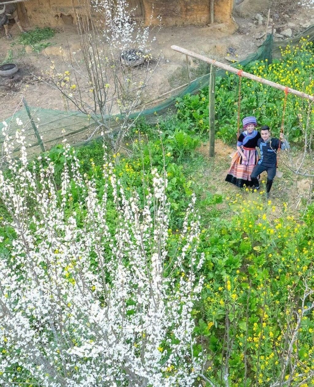 Les fleurs blanches contrastent avec le ciel bleu clair, se mêlant aux roses des cerisiers en fleurs et aux jaunes des fleurs de colza, faisant de Ta Van un tableau multicolore au cœur des vastes collines et montagnes.