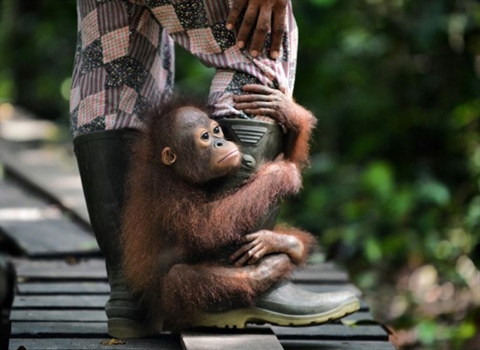 | Un jeune oran-outang tenant la jambe d'une employée d'une ONG à Ketapang, en Indonésie, le 4 août. |