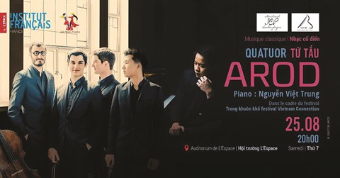 Le Quatuor Arod, composé de quatre jeunes prodiges, s’est déjà fait un nom dans le monde de la musique classique. Créé en 2013, il remporte, entre autres, le premier prix du prestigieux Concours international de l’ARD de Munich. Invité au Vietnam pour la première fois, dans le cadre du festival Vietnam Connection Music 2018, le Quatuor Arod partagera la scène avec le pianiste virtuose Nguyên Viêt Trung, lauréat de nombreux prix internationaux.