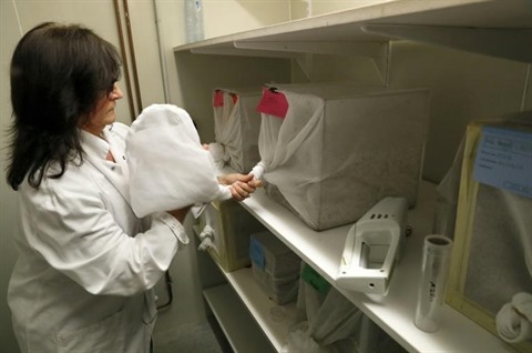 | La scientifique Anna-Bella Failloux étudie des moustiques à l'insectarium de l'Institut Pasteur à Paris, le 30 mars 2017 |