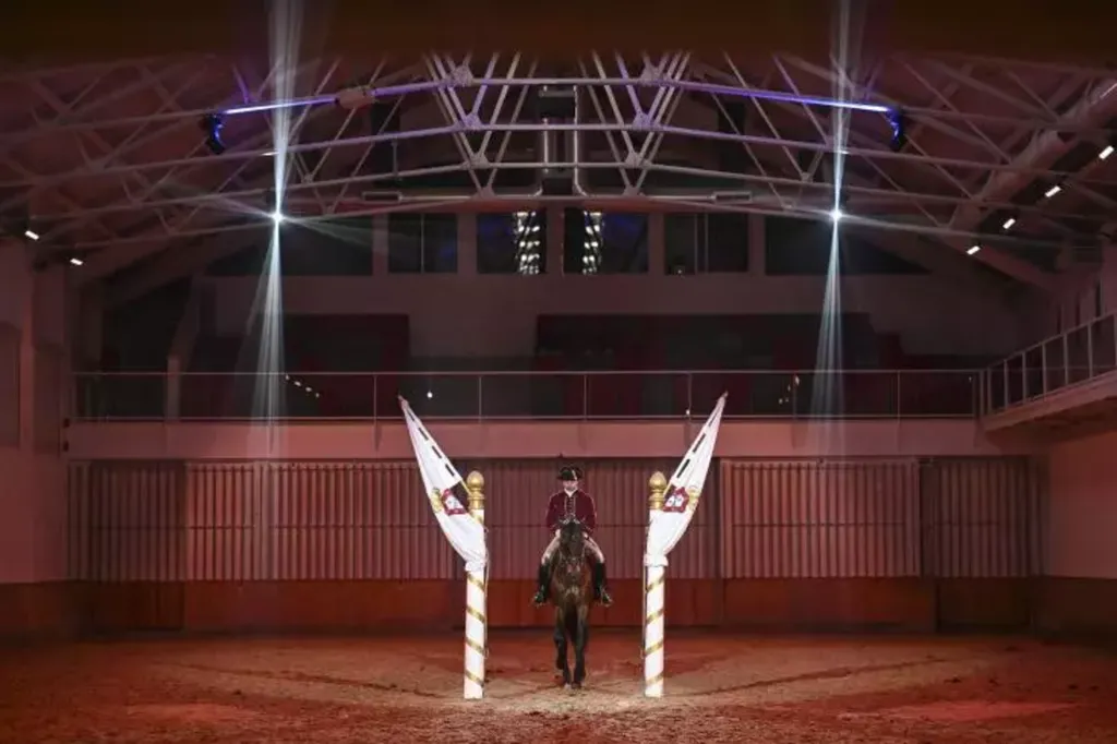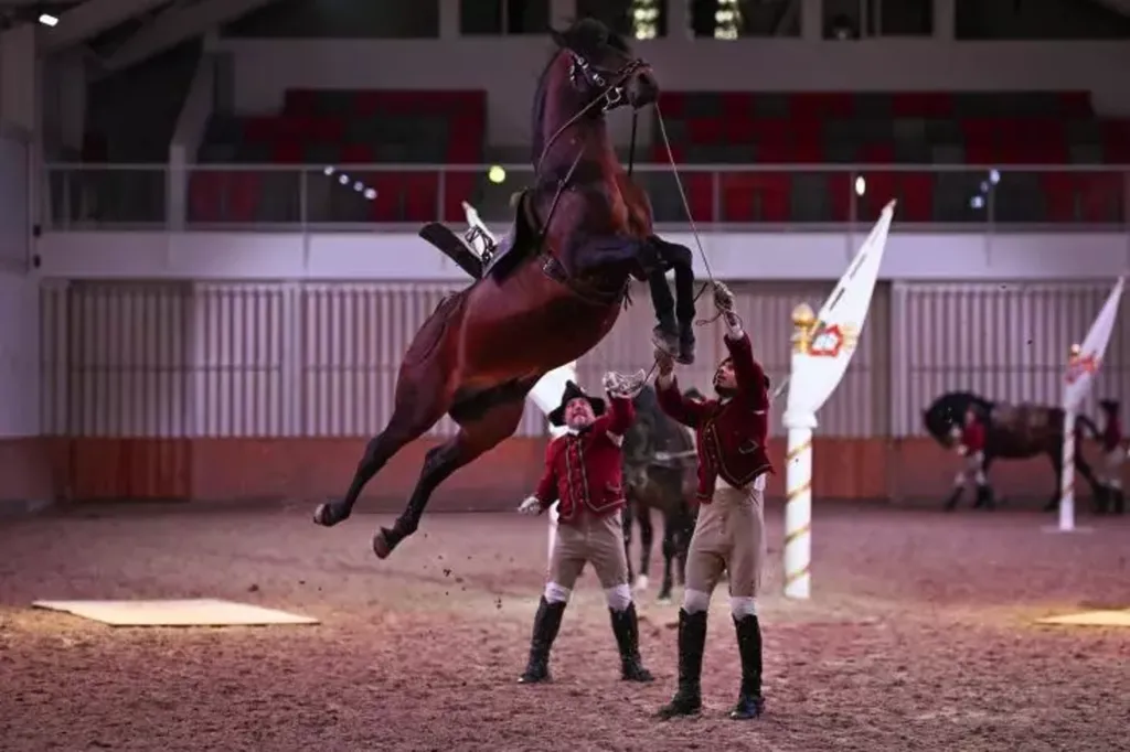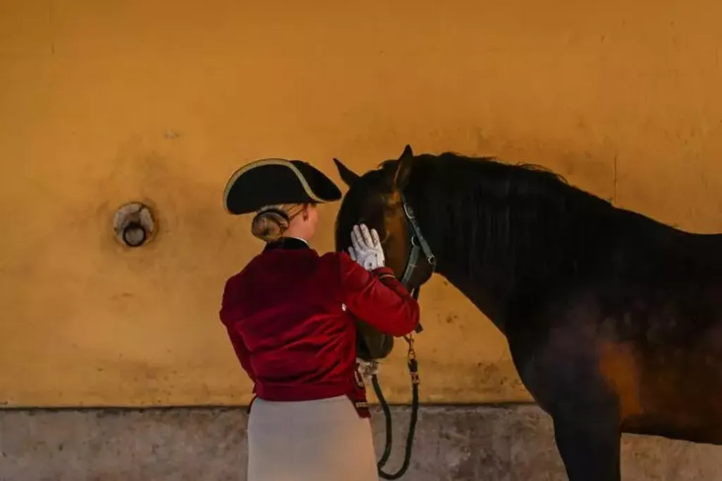 Des cavaliers, montés sur des selles en peau de chamois ou de tapir, vêtus de costumes de gala avec manteaux de velours bordeaux, jambières en cuir et tricorne noir, enchaînent sur fond de musique classique des exercices chorégraphiés tels qu'ils se déroulaient à la cour royale.
