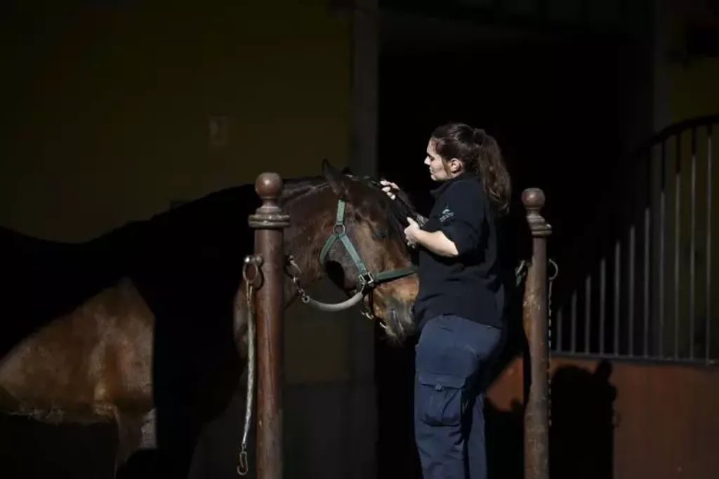 | Une soigneuse prépare un pur-sang lusitanien avant un spectacle de dressage à l'école d'art équestre de Lisbonne, le 15 janvier 2024 au Portugal. |