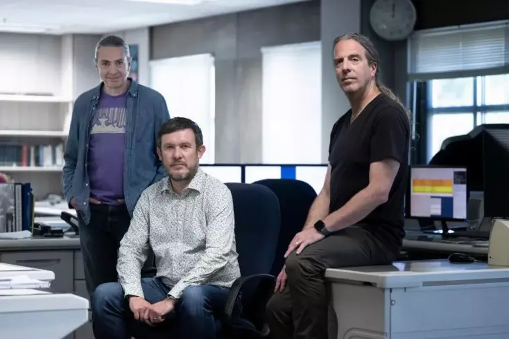 | De gauche à droite : David MacMahon, Steve Croft, et Matt Lebofsky, responsables pour le projet Breakthrough Listen Initiative, posent dans la salle de contrôle du radiotélescope de l'observatoire de Green Bank, le 21 mai en Virginie-Occidentale. |