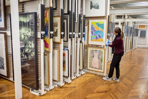 | Une employée de la collection d'œuvres d'art du gouvernement britannique dans la réserve des peintures, le 28 septembre à Londres. |