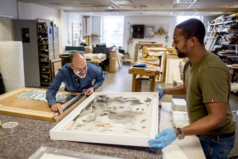 | Deux employés de la collection d'œuvres d'art soumettent un tableau à un "processus de tropicalisation", le 28 septembre à Londres. |