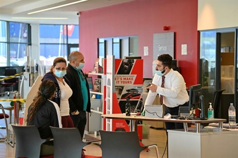 | Des clients et un vendeur masqués dans une concession automobile de Vauxhall dans le nord de Londres, le 4 juin. |