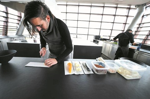 | Le chef Jordan Kahn (gauche) prépare des coquilles Saint-Jacques à la moelle et aux lamelles d’asperges blanches dans son restaurant Vespertine, en Californie. |