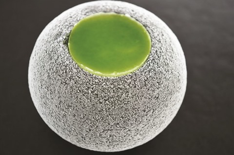 | Un bouillon glacé de petits pois, kiwi épicéa et verveine servi au restaurant Vespertine du chef Jordan Kahn. |