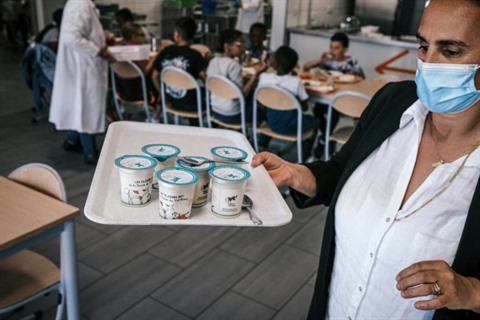 | Desserts bio de la ferme du Val Fleury servis à la cantine Johannes Masset de Lyon (Centre-Est de la France), le 28 mai. |