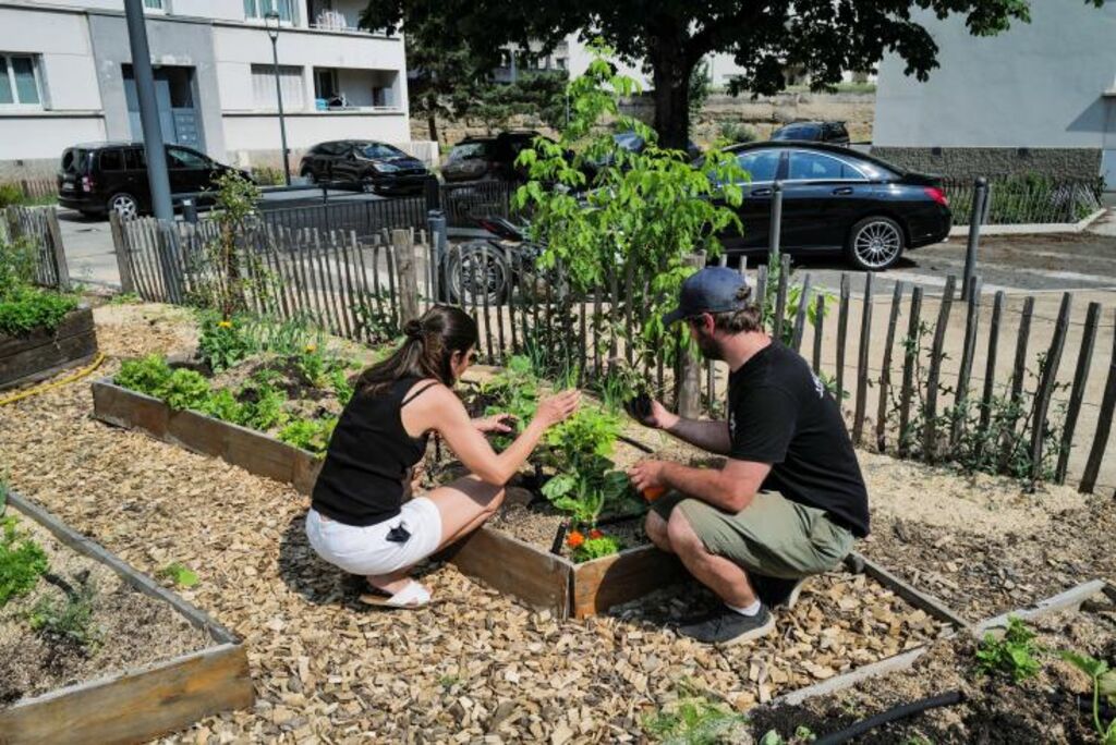 | Un jardinier éduque une habitante à l'agriculture urbaine, le 4 juin à Lyon. |