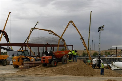 Le long de l'autoroute, des dizaines de camions soulèvent des nuages de poussière sur un immense terrain vague où près de 400 ouvriers travaillent jour et nuit depuis juillet. Les bétonneuses tournent à plein régime, des tuyaux crachent des litres de ciment, des soudeurs font jaillir des étincelles de hauts piliers.