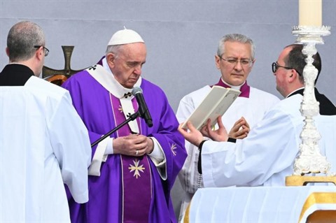 | Le pape François célèbre la messe devant au moins 12.000 personnes à Floriana, près de la capitale de Malte La Valette, le 3 avril 2022. |