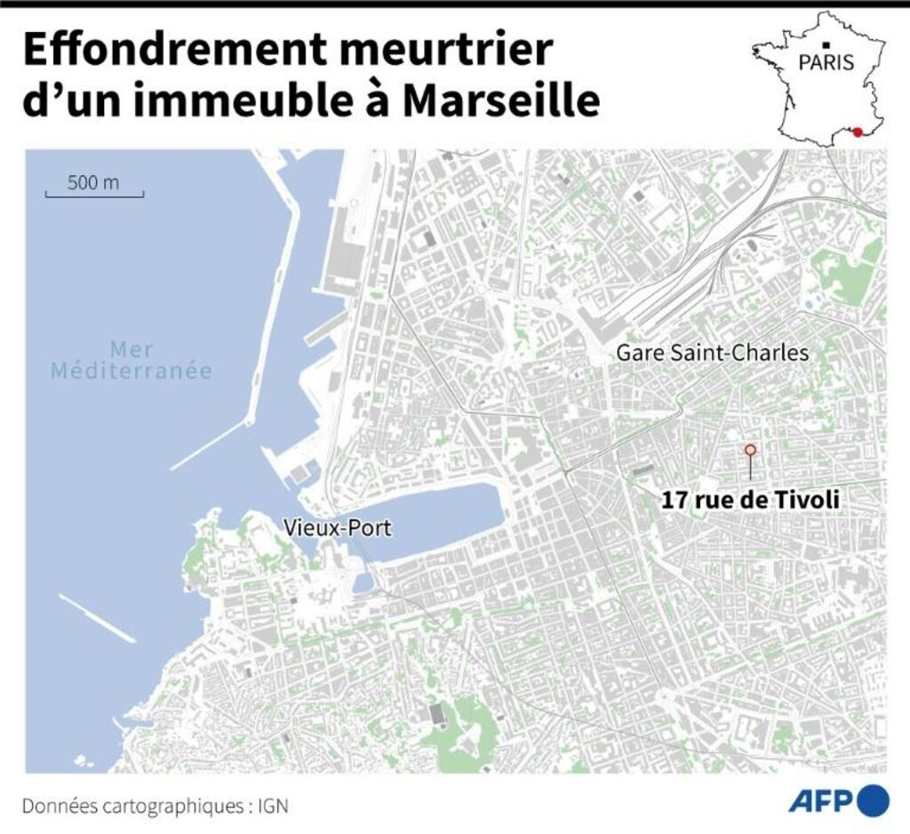 | Carte zoomée de Marseille localisant l'immeuble qui s'est effondré dans le centre de la ville. |
