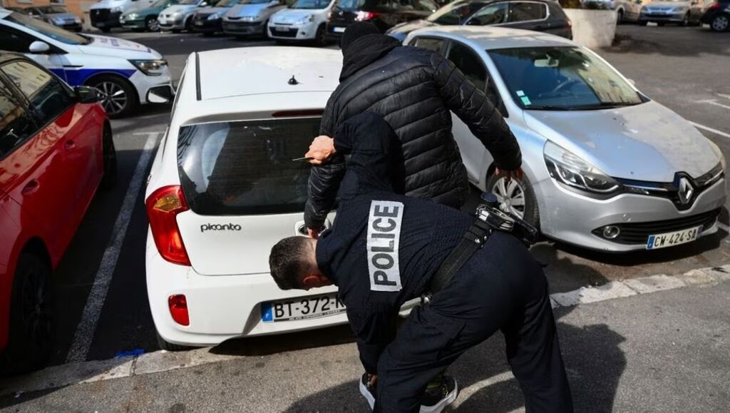 | Un policier d'une unité spécialisée de terrain fouille un dealer présumé dans un quartier nord de Marseille, le 31 mars 2023. |