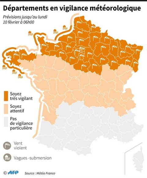 | Carte des départements placés en vigilance météorologique par Météo-France au passage de la tempête Ciara le 9 février. |