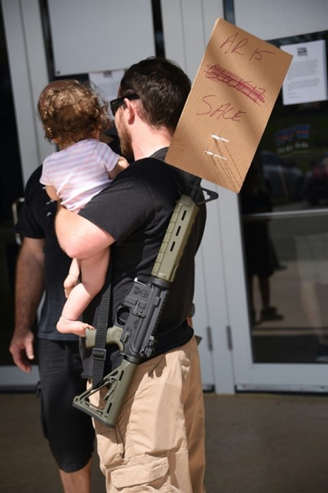 | Un homme accompagné de son bébé porte en bandoulière un fusil semi-automatique de type AR-15, semblable à celui utilisé par un jeune homme qui a tué 17 personnes dans un lycée de Floride. |