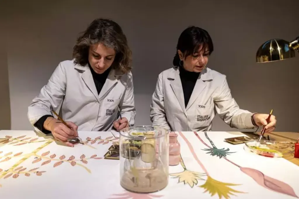 | Des artisans exposent leur savoir-faire à l'entrée du défilé Tod's, à Milan, le 27 février. |