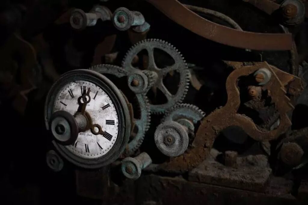 | Un mécanisme d'horlogerie du temple protestant de Saint-Martin, à Montbéliard, dans le Doubs, le 17 avril. |