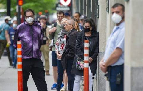 | De nombreux clients patientent à l'extérieur du magasin Simons pour la réouverture, à Montréal (Canada), le 25 mai. |