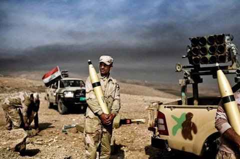 | Un membre des forces irakiennes se prépare à lancer des roquettes sur les positions jihadistes lors de l'offensive pour reprendre Mossoul, le 27 février |