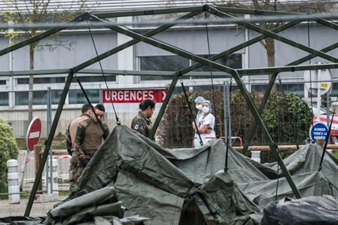 | L'Hôpital militaire de campagne à l'extérieur de l'hôpital Emile Muller à Mulhouse, le 22 mars. |