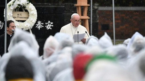 | Le pape François rend hommage aux victimes de la bombe nucléaire à Nagasaki, le 24 novembre 2019. |