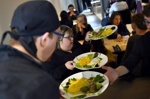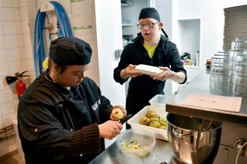 | Deux employés trisomiques dans la cuisine du restaurant Le Reflet à Nantes, dans l'Ouest de la France, le 9 février. |