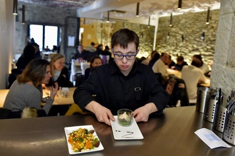 Dans la salle de 36 couverts et en cuisine, tout a été "pensé et adapté pour les personnes trisomiques" : des assiettes ergonomiques pour plus de stabilité, une prise de commandes simplifiée pour les serveurs qui ne savent pas tous lire et écrire, une carte réduite, mais aussi une salle de repos et une semaine de travail réduite à 24 heures, égrène Flore Lelièvre, 26 ans, à l'origine de l'établissement.