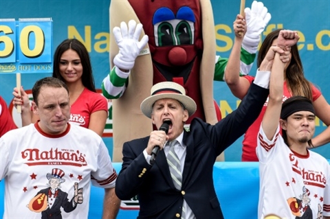 | Avec 62 hot-dogs avalés en 10 minutes, Matt Stonie (droite) a battu Joey Chestnut (gauche) au concours d'ingestion de hot-dogs le 4 juillet à New York. |