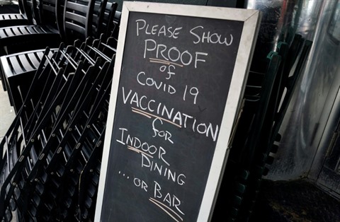 | Une pancarte devant un restaurant à New York, le 17 août, prévient qu'il faut montrer une preuve de vaccination pour un repas à l'intérieur. |