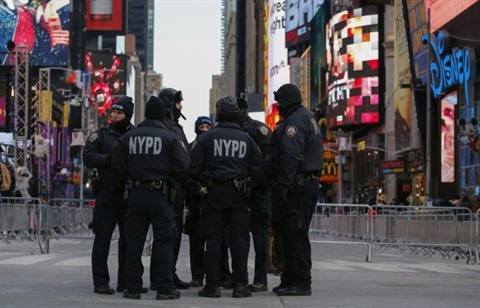 | Des policiers new-yorkais en patrouille à Times Square, le 31 décembre 2017. |