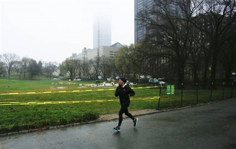 | Une joggeuse passe devant le site où est installé un hôpital de campagne, dans Central Park, à New York, le 29 mars. |