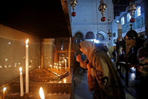 | Une chrétienne prie à l'église de la Nativité, le 24 décembre à Bethléem, en Cisjordanie. |