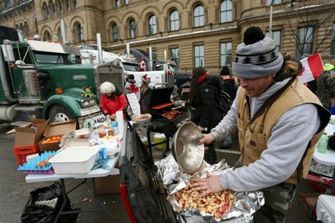 | Un stand dans les rues d'Ottawa pour permettre aux manifestants de se restaurer, le 11 février. |