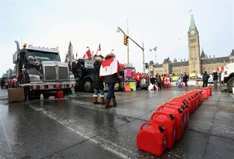| Dans les rues d'Ottawa, les bidons de carburant pour ravitailler les camions des protestataires, le 9 février 2022. |