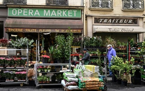 | Des clients attendent à l'entrée d'une épicerie qui vend aussi des fleurs à Paris, le 17 avril. |