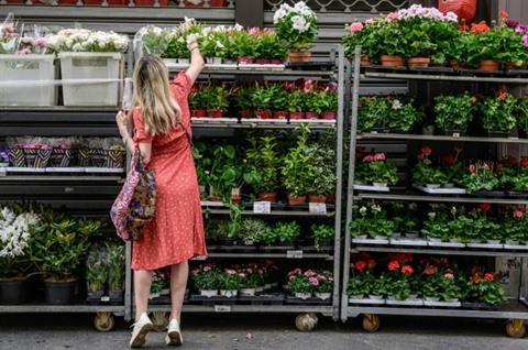 | Une cliente choisit des plantes à l'extérieur d'un supermarché à Paris, le 17 avril. |