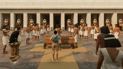 Pour le guider, la déesse égyptienne Bastet (qui a la forme d'un chat géant) et "Mona", un guide touristique qui se charge de détailler les prouesses de la construction des pyramides, la signification des dieux ...