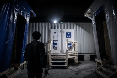 Quatre lits, chacun sa prise électrique, "primordiale pour les migrants", son casier, une palissade pour un peu d'intimité.