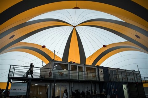 À l'entrée, la bulle-pôle d'accueil, en toile pvc tissée lestée par des blocs de béton servant aussi de bancs, est formée de trois lobes rehaussés de ronds de couleur, touche de gaîté pour "qu'ils ne soient pas simplement sous une tente à côté d'une décharge..."
