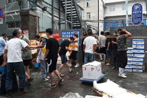 | Des Chinois sortent des marchandises du marché Xinfadi, fermé après l'apparition d'un nouveau foyer de coronavirus, le 13 juin à Pékin. |