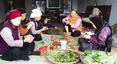 | Dans la soirée, les vieilles femmes se réunissent pour préparer les chiques de bétel. |