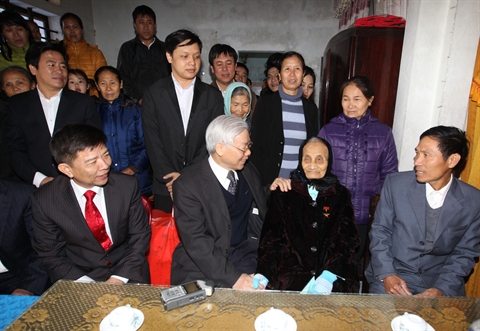 | Le chef du Parti (2e, à gauche) est allé offrir des cadeaux à la Mère héroïne Lai Thi Sen, domicilée dans la commune de Bao Ninh, ville de Dông Hoi. |