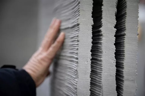 | Un mur en béton imprimé dans l'atelier de la société XtreeE à Rungis, près de Paris. |