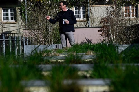 | Le botaniste Hervé Tiger dans le pollinarium installé sur le toit d'une bibliothèque, Rennes, le 18 mars. |