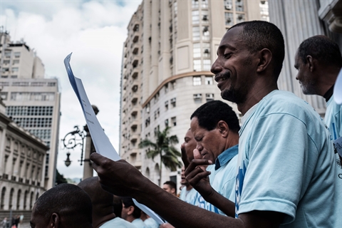 Sur les escaliers extérieurs de l'imposant Teatro Municipal, l'Opéra de Rio, une soixantaine d'entre eux ont charmé les passants en interprétant une demi-douzaine de chansons dans le cadre du projet "With One Voice" (D'une seule voix), lancée par l'ONG britannique Streetwise Opera en 2012 pour les JO de Londres.